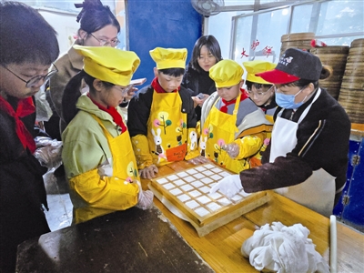 在老炉边,东街社区关工委常务副主任吴鹏祖把裹好馅的面饼往炉壁上贴。同学们凑过来细细观察,耐心等待十几分钟,大炉饼新鲜出炉,咬上咸香四溢、酥得掉渣。同学们在轻松愉快的氛围中,深入体会了季市美食的魅力。