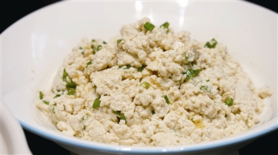 本土美食节目《双鱼厨房》曾以东兴老豆腐为主角,特别推介了小葱拌豆腐的制作过程。将老豆腐置于浅碗内,用筷子戳数次,豆腐戳成颗粒糊状即可。这种状态的豆腐依然保持些微韧劲,且最易吸收各方味道。根据个人口味,辅以葱末、细盐、麻油等拌匀,“一清二白”的小葱拌豆腐就能上桌了。