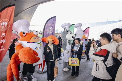与美食吉祥物合影