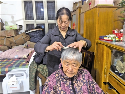 顾利君给母亲梳头。