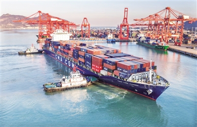 图为12月5日,一艘大型集装箱船舶驶入江苏连云港港。新华社发