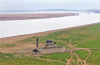 12月14日6时,在我国最大淡水湖鄱阳湖标志性水文站星子站,8米的水尺刻度露出水面,标志着鄱阳湖跌破极枯水位线。目前,鄱阳湖通江水体面积较丰水期减少九成。图为鄱阳湖水位下降,湖区的千年石岛落星墩完全展露出来(12月13日摄)。新华社发