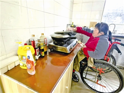 在张国芬家,改造后的卫浴间焕然一新。“这几年我一直想把浴缸改成淋浴设施,市残联帮我完成了心愿。工作人员还特地根据我坐在轮椅上的高度,设置置物架,增加扶手,现在我洗澡方便多了。”张国芬高兴地说。她家厨房也添置了一个高度62厘米、长145厘米、宽60厘米的定制灶台。张国芬滑动轮椅靠近定制灶台,点火、烧煮,一气呵成。