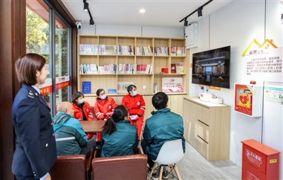 图为快递员、环卫工人代表在“民声税务”工会驿站观看宣讲直播。