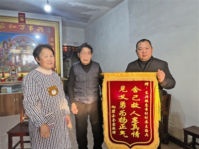 本报讯 (融媒记者王旭 通讯员邵圆圆)12月18日下午,东兴镇惠圣村村民向碧玉将一面写有“舍己救人显真情 见义勇为扬正气”的锦旗,送到村委会工作人员王海兵手中,感谢王海兵在12月17日晚上见义勇为,从冰冷的河水中救出她的丈夫沈纪发。