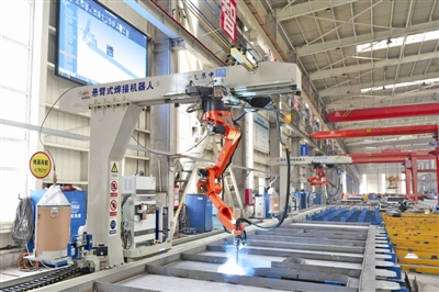 在近日于重庆举行的第二届制造业智能化解决方案创新大赛总决赛中,中铁建大桥工程局集团靖江重工有限公司《桥梁钢构柔性智能焊接工作站解决方案》荣获智能机器人创新赛道二等奖,并在总决赛期间举行的智能制造及检测装备展上展示创新成果。该柔性智能焊接机器人目前已应用于企业钢箱梁横隔板焊接作业,为其今后在工业机器人领域的深入应用与推广奠定了实践基础。图为智能焊接机器人应用于企业焊接作业。刘丽摄