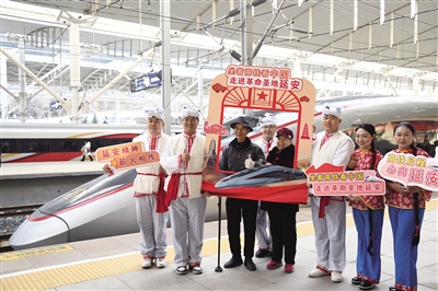 图为12月26日,乘客与演员在延安站站台合影留念。新华社发