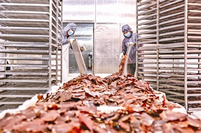 元旦、春节将至,食品市场订单量持续走高。近期,靖江市味乐食品有限公司生产车间内一片忙碌,工人们全力赶订单、忙生产,保障节日市场供应充足。图为工作人员正在加紧生产企业新休闲食品“安格斯牛脆脆”。
