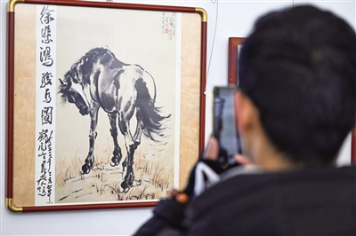 ?12月29日,参观者在天津古文化街参观“喜迎马年,五代画马人马画艺术展”。新华社发