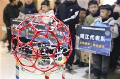 少年宫三楼的一间教室里,每到周日下午,活力满满的少年音穿过走廊,飘出去很远。下午2点多,少年们正忙着进行无人机足球对抗训练,握着遥控器,手指飞舞,操控无人机穿越空中的球门。在此前举办的泰州市首届城市无人机足球联赛(靖江站)比赛中,参赛的靖江队伍取得了不错的成绩,少年们正加紧训练以备战其他赛区的比赛。