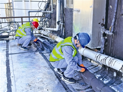 图为水务集团工作人员对供水管道进行防冻保暖。