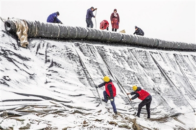为应对近期大范围寒潮和低温雨雪冰冻天气,各地积极采取措施,全力保障人民群众安全温暖过冬。图为1月19日,在河南省焦作市博爱县孝敬镇博爱源蔬菜专业合作社,辖区供电职工帮助菜农对蔬菜大棚保暖棉被进行维护。??新华社发