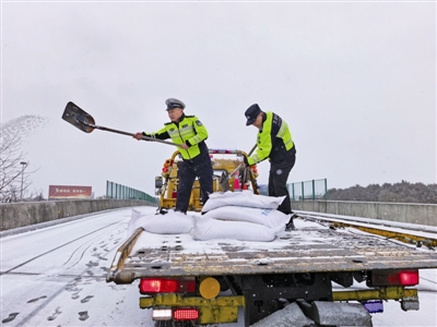 1月20日上午,记者在渔婆南路彩虹桥看到,城西环卫所的环卫工人在桥面撒布融雪盐;南环路合兴桥上,扫雪车和撒布车协同配合、来回穿梭,高效清除桥面、路面积雪,防止路面桥面结冰影响出行。