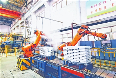2月14日,湖口高新技术产业园的江西铜业铅锌金属有限公司锌熔铸生产线上,机器人正在整齐码放炼好的锌锭。去年,该公司营收达114亿元,成为园区第三家年营收过百亿元企业。今年1月,公司营收超10亿元,同比增长20%,实现开门红。本报全媒体记者 尹晓军摄