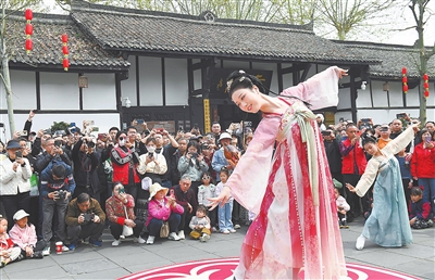 4月5日,游客在四川省阆中古城贡院广场观看“鼓上舞”。 新华社发(王玉贵摄)
