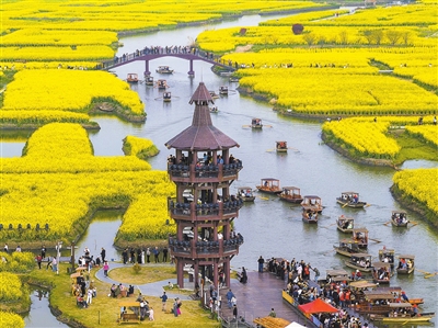 4月5日,游客在江苏省兴化市千垛景区赏花游玩(无人机照片)。 新华社发(周社根摄)