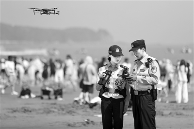 ?5月4日,浙江省舟山市公安局普陀山分局朱家尖派出所青年民警利用无人机对辖区景区进行空中巡查。 新华社发 (邹训永摄)
