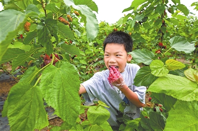 5月3日,一名小游客在抚州市东乡区邓家乡花果山生态园老金果园采摘桑葚。特约通讯员 何江华摄