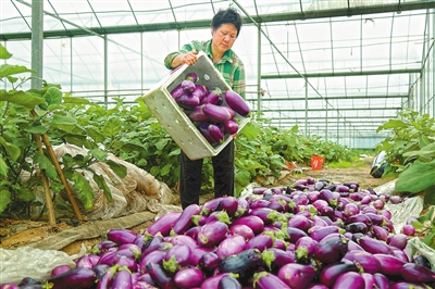 5月8日,在石城县屏山镇百良富硒蔬菜产业园,大棚蔬菜成熟上市,村民正在采收茄子。通讯员 曾 艳摄