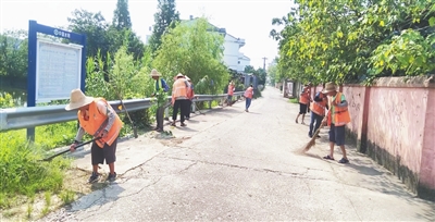 为打造干净整洁的村容村貌,深入推进农村人居环境大整治,7月15日起,南昌县富山乡组织外包公司的环卫工人30人、作业车3辆,集中对辖区背街小巷、房前屋后、村周边及池塘垃圾进行大清理,为广大村民营造一个美好清洁的生活环境。图为环卫工人清扫路边杂草和垃圾。 李 强摄