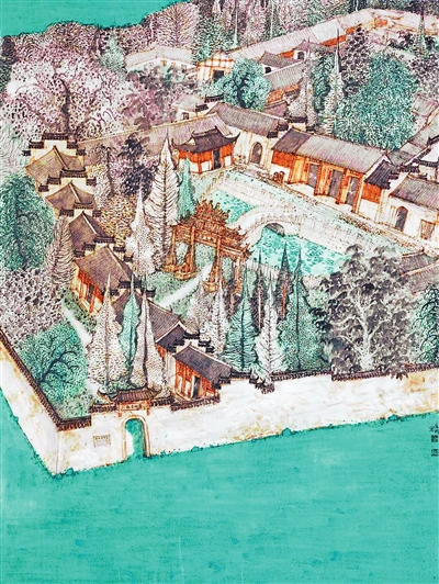 由中国美协主办的“第三届公望富春·中国山水画作品展”,近日在杭州富阳公望美术馆举行,我的作品《鹅湖忆秋》(上图)荣幸入选。这件作品,每一寸宣纸都仿佛浸润着我对江右书院炽热而深沉的情感,承载着我在艺术道路上不懈探索的赤诚之心。 我的创作灵感,始于江西四大书院之一的鹅湖书院。初见时,它古朴的气质便如磁石般深深吸引着我。而“秋”,则是我为这幅画倾注的灵魂。它不仅是视觉的华美诗篇,更成为我追忆往昔岁月的时光纽带,承载着我对宁静大自然的美好向往。我怀揣满腔热忱,试图在宣纸上营造出书院清幽静谧的氛围,使观者踏入这片由笔墨构筑的秋之世界,如我一样沉浸其中,心灵与自然和谐交融。 《鹅湖忆秋》高210厘米,宽160厘米。在构图中,我大胆采用俯视视角,将画面以不规则形状置于上方,宛如一片飘落的秋叶,充满了自然随性之美。然后用大面积的青绿巧妙切割画面,构建出虚实相生、疏密得当的布局。这种设计打破了传统构图的束缚,不仅增强了画面的空间感与纵深感,更如同一扇通往全新视觉世界的大门,为观者带来全新的视觉体验。 在色彩运用上,以赭色、灰色渲染书院建筑,凸显其历经岁月沉淀的沉稳厚重;以墨绿、浅褐描绘自然景物,展现出大自然蓬勃的生机与活力;淡青绿色调的巧妙搭配,营造出清新悠远的氛围,让整个画面弥漫着清幽宁静、古朴雅致的意境。 在技法上,我坚持兼工带写的创作原则,力求在细腻写实与写意神韵之间寻找完美的平衡点。对书院建筑的飞檐斗拱、树木纹理等细节精心雕琢,力求细腻写实;同时,借助色彩的自然晕染,让写意的神韵在画面中自然流淌。以传统青绿山水为根基,线条勾勒刚柔并济,赋予物象生动的形态与质感。淡雅的设色中,青绿与赭石相互映衬,宛如一对默契的舞伴,舞出秋景的清新脱俗与古雅意趣。水墨的自然晕染,如同一缕轻柔的秋风,让画面过渡柔和自然,秋意的朦胧悠远在宣纸上缓缓铺陈开来,似一首无声的诗,余韵悠长。 《鹅湖忆秋》以中式建筑为骨立形,淡雅色调为韵赋神,疏密景致为境传情。勾勒渲染间涤尽喧嚣,愿观者入此水墨天地,在山水诗意中暂抛纷扰,寻得心灵安宁,感受传统美学的永恒魅力与精神升华。
