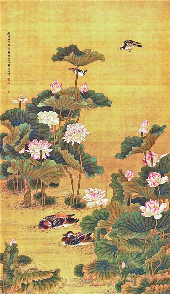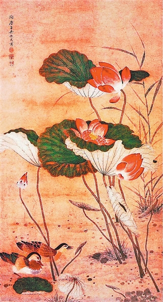 夏天,荷花在荷塘中宛如仙子临水而立,绽放出淡雅的清香。而在荷塘的怀抱中,总有鸳鸯悠然自得地游弋于水面。荷花与鸳鸯,它们相互映衬,共同构成了夏日的浪漫。古代许多画家钟情于这种意境,以荷花与鸳鸯为题材,创作出了许多经典之作。 明末清初书画家陈洪绶的《荷花鸳鸯图》(图1,现藏于北京故宫博物院),作者绘画技艺高超,作品蕴含深厚的文化底蕴和作者的情感寄托。画面描绘了一个充满生机的荷塘景象。4朵荷花或内敛含苞,或羞涩初绽,或优雅盛开,亭亭玉立。荷叶阔大,衬托出荷花的娇美可人。水面上一对鸳鸯打破了荷塘的宁静,为画面增添了一份浪漫与温馨。此外,画面中还有青蛙、彩蝶等小动物。青蛙隐伏于石后的荷叶上,弓身欲动,仿佛随时准备捕食;两只彩蝶舞于花间,与荷花、荷叶相映成趣。在色彩方面,陈洪绶巧妙地运用了鲜艳的红色和优雅的白色来描绘荷花和鸳鸯,使画面色彩鲜明。同时,他还运用淡雅的绿色和灰色来渲染荷叶和湖石,使画面色彩更加和谐统一。 清代画家吴振武的《荷花鸳鸯图》(图2,现藏于上海博物馆),则以色彩运用上的极高造诣,展现了大自然的和谐与宁静。画面中,芦苇丛生,随风摇曳,清澈的水面上,一对鸳鸯正相伴而游,姿态亲昵,温馨和谐。在构图上,作者巧妙地运用了远近、疏密、虚实等对比手法,使整个画面既生动又富有层次感。几朵红荷在荷叶的映衬下更显娇艳欲滴,或含苞待放,或盛开如锦,为整个画面增添了亮色。荷叶的碧绿与荷花的红艳形成鲜明对比,而水波、水草、芦苇的淡墨则起到了很好的衬托作用。 清代画家沈铨的《荷花鸳鸯图》(图3,安徽博物院藏),画面以池塘为背景,荷叶层层叠叠,有的鲜嫩,有的苍劲,展现出生命的蓬勃与活力。水面浮萍飘移,为这宁静的荷塘增添了几分灵动与生机。荷塘中,一对鸳鸯姿态亲昵,温馨而宁静。 荷花在中国文化中象征着高雅和纯洁,鸳鸯则代表着美满爱情与幸福家庭。这3幅画中鸳鸯相互依偎、不离不弃的温馨场景,使人产生对美好爱情的憧憬与向往。我们在夏日里欣赏古人的经典之作,心中似乎感受到了一片宁静与温情。