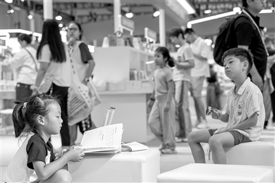 7月25日,小朋友在“书博会”现场看书。
