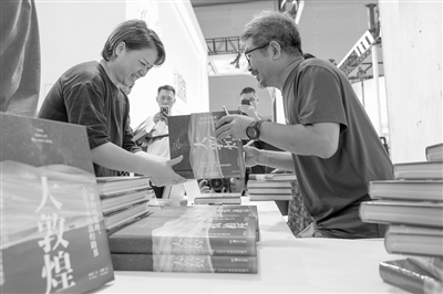 7月25日,“书博会”现场,新书《大敦煌》作者孙志军(右)与读者互动。