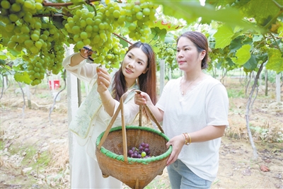 近年来,万年县苏桥乡大力开发休闲农业和乡村旅游精品线路,走出一条农文旅融合发展的新路。图为7月21日,游客在苏桥乡道山葡萄基地采摘葡萄。特约通讯员 徐声高摄