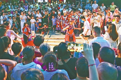 彝族村民和游客载歌载舞,歌声、笑声、欢呼声汇成一首民族团结的欢乐颂歌。