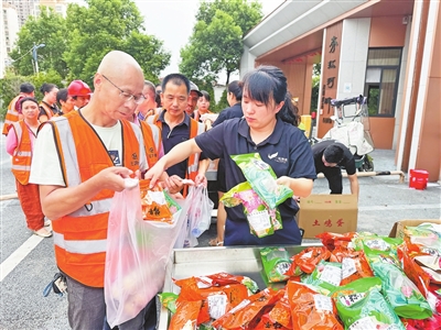7月28日,环卫工人在领取爱心礼包。当日,宜春市袁州区民政局、宜善同行慈善超市、舒一鸣置换超市联合开展关爱环卫工人暖“橙”行动,向100名环卫工人赠送鸡蛋、粽子、拖鞋、运动鞋等物资。 本报全媒体记者 邹海斌摄