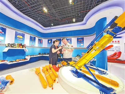 消防员与企业负责人探讨研发细节。 本报全媒体记者 付 强摄 |