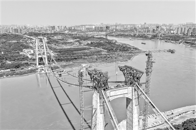 这是7月30日拍摄的重庆黄桷沱长江大桥主缆架设作业现场。当日,黄桷沱长江大桥顺利完成主缆架设工作,标志着大桥建设即将进入钢桁梁吊装工序。黄桷沱长江大桥全长1260米,主跨765米,为单跨悬吊双塔三跨连续钢桁梁悬索桥,是国内最大跨径公轨两用悬索桥。黄桷沱长江大桥是渝长高速复线连接道工程的控制性节点工程,建成后将成为联系重庆主城区长江南北两岸的重要交通干道。 新华社记者 唐 奕摄
