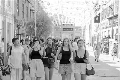 人们在哈尔滨中华巴洛克历史文化街区游览(7月30日摄)。 作为中外闻名的“冰城”,哈尔滨的夏天也在不断“焕新”,来哈尔滨“避暑游”备受青睐。近年来,哈尔滨不断挖掘历史底蕴,加快历史文化街区改造和老建筑活化利用。文旅新题材新亮点不断涌现,哈尔滨旅游逐步实现从“冬季爆点”向“四季长红”转型。 新华社记者 王 松摄