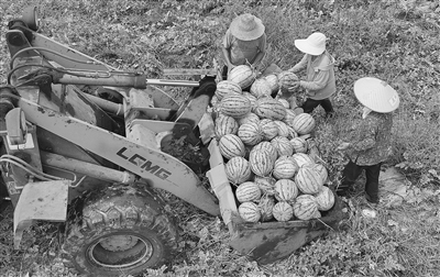 ▲近日,永丰县西瓜喜获丰收。图为8月1日,该县七都乡马蹄洲村瓜农正在摘西瓜。 通讯员 刘浩军摄