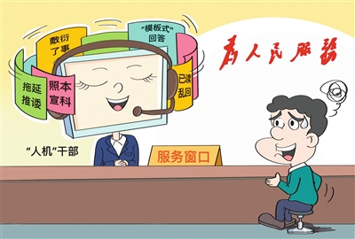 方便群众办事是政务服务的出发点和落脚点,当好“人工客服”、精准解答问题是干部的基本职责。然而,一些干部在面对群众求助时却“人机感”十足,如设定程序一般,只会对着文件照本宣科,一问及信息盲区便“宕机”,或反复检索相关资料、模板化作答,或“已读乱回”无关信息、套路化回应,甚至拖延推诿敷衍了事、机械化作为。杜绝“人机”现象,需要干部从思想到行动实现转变,真正做到把群众当亲人,用真心、真情、真意为群众办实事、解难题,让政务服务回归以人为本的本质。 (王 楠 文/图)