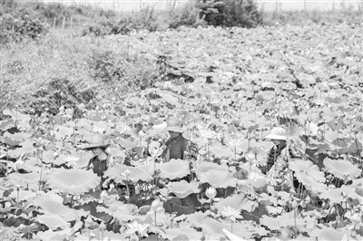 近年来,峡江县罗田镇依托当地良好生态环境,因地制宜推广种植经济作物,提高农民收入。图为7月31日,该镇新江村白莲种植基地,莲农正在采收莲蓬。本报全媒体记者 吴福清摄
