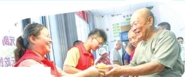 七月十六日,在瑞昌市桂林街道黄家湾社区幸福食堂,志愿者正在为老人们打菜。陈迪权、魏东升摄 |