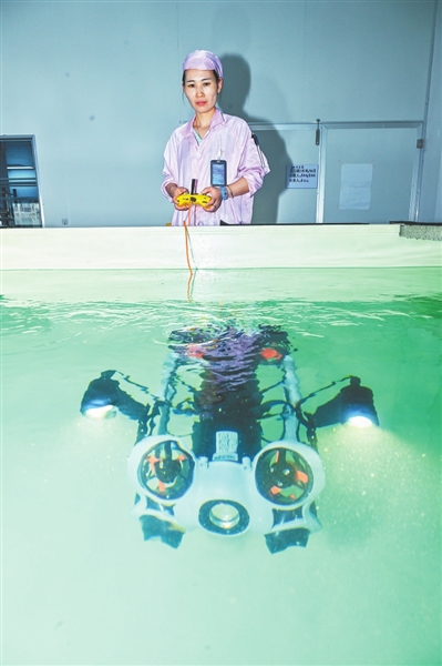 6月5日,赣州市潜行科技有限公司产品测试实验室,工作人员正在检测水下机器人新产品的性能。