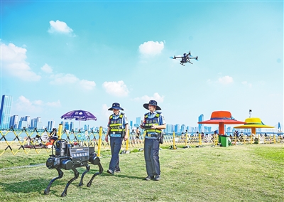 8月3日,南昌市公安局红谷滩分局警航中队民警带着机器狗和无人机,在摩天湾天然泳场巡逻。