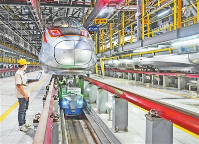 7月31日,在南昌车辆段南昌西动车组运用二所,图形检测分析师陈安中正操作动车组车底智能检测机器人拍摄采集图像。