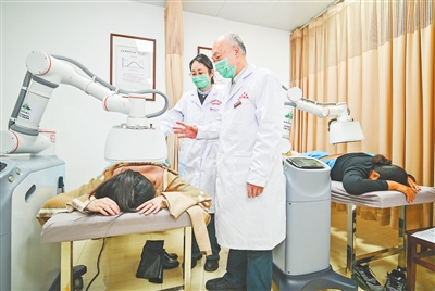 3月6日,在江西中医药大学附属医院西湖院区,热敏炙创始人陈日新(右)教授利用热敏炙机器人进行临床治疗。