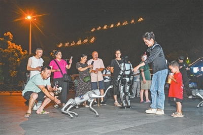 8月2日,在萍乡武功山风景名胜区,智能机器人、机器狗与游客互动。