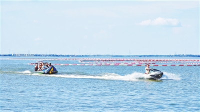 进贤县充分利用军山湖优质水资源优势,做好水文章,促进文旅体融合发展。图为8月5日,在三阳集乡军山湖水世界,游客正在体验水上游乐项目。 通讯员 樊哲平摄