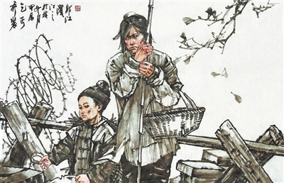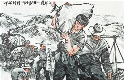 图5:《突破封锁》 赣南、粤北群众纷纷组成“运盐敢死队”,冒着生命危险,冲破敌人的重重关卡,穿过崎岖险峻的山道,把食盐送到中央苏区。