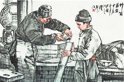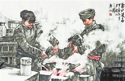 图4:《盐水浸衣》 赣南、粤北群众把食盐融化,浸到棉衣里。到达中央苏区后,再把棉衣里的盐水拧出,在锅里蒸发成食盐。