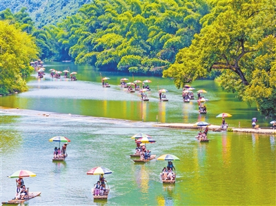 ▲7月31日,人们在广西桂林市阳朔县遇龙河乘坐竹筏漂流(无人机照片)。 “三伏”是初伏、中伏、末伏的统称,全国多地会在“三伏”迎来持续高温。“有风依旧热,初伏几时休。瓜果谁新饷,谗涎小忍休。”这是宋代诗人杨万里描绘的伏天景象。今年7月20日(农历六月二十六)入伏,人们在伏天中享用瓜果冷饮、亲水嬉戏游玩,用各种方式避暑消夏。 新华社发(何华文摄) |