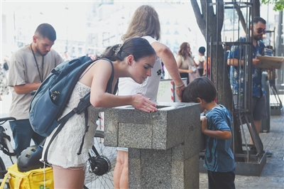 8月4日,一名女子在西班牙马德里街头补水。 当日,西班牙国家气象局发布特别提醒,全境大部分地区受到热浪影响,西南部地区最高气温预计突破42摄氏度。 新华社发(古斯塔沃·巴连特摄)