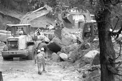 8月8日,救援人员在榆中县马坡乡山洪灾害现场抢修中断道路。 新华社发 (金万贵摄)