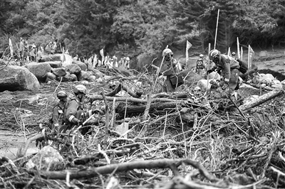 8月10日,在甘肃省榆中县马坡乡,甘肃省森林消防总队、国家西北区域应急救援中心救援人员拉网式搜救失联人员。 8月10日,国家综合性消防救援队伍救援人员在甘肃省榆中县马坡乡马莲滩村、旧庄沟村和城关镇兴隆山村等区域持续搜救失联人员。 新华社发 (白期元摄)